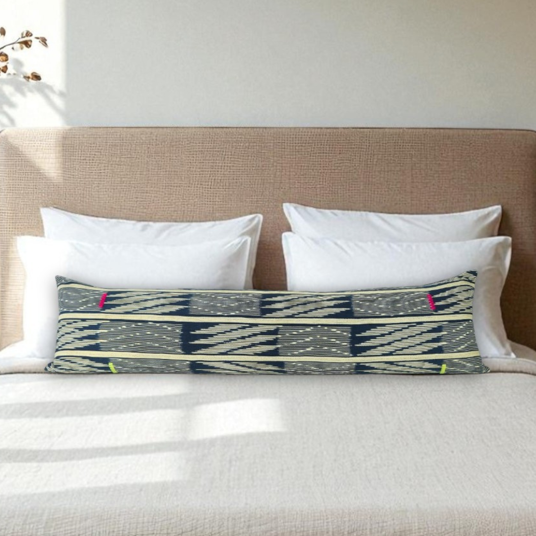 The fabric for this lumbar pillow is vintage Baule sourced from the Ivory Coast and handmade by artisans. The pillow cover is finished with our natural linen blend backing and closed by a hidden zipper.