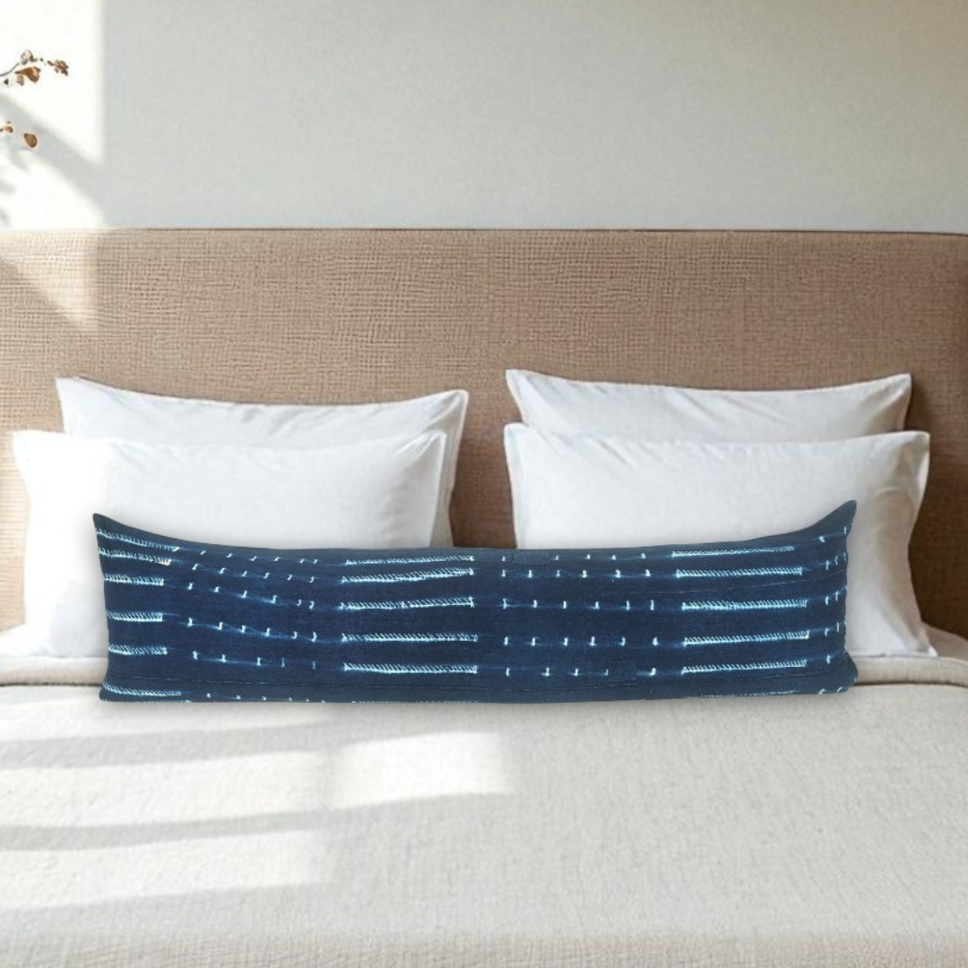 This pillow is made from vintage indigo fabric sourced from Africa and made by artisans. The pillow cover is finished with our natural linen blend backing and closed by a hidden zipper.