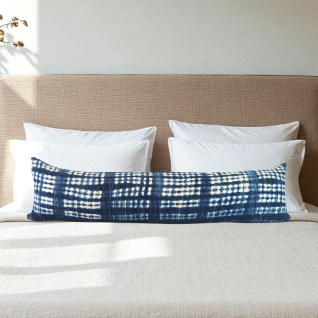 This pillow is made from vintage indigo fabric sourced from Africa and made by artisans. The pillow cover is finished with our natural linen blend backing and closed by a hidden zipper.